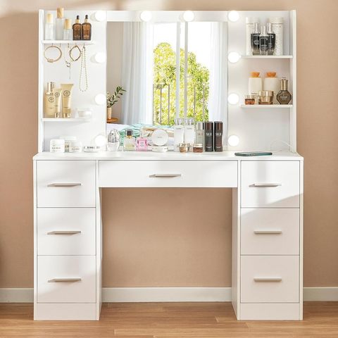 Scrivania per il trucco della fattoria con specchio scorrevole e tavolo per la ricarica con luci e scaffali nascosti